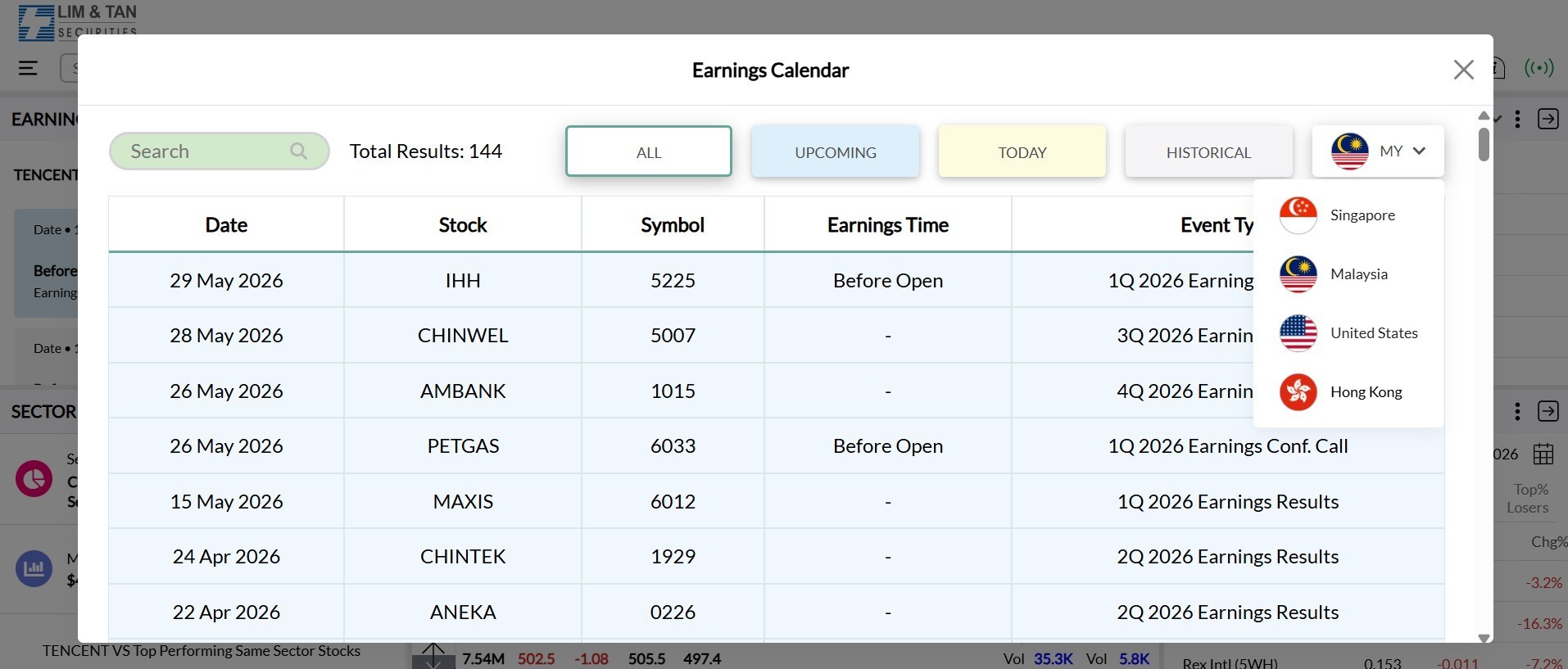 All earnings events are aggregated by counters in the selected markets, namely Singapore, United States, Hong Kong or Malaysia. This includes a search function to look up earnings details under ALL, UPCOMING, TODAY or HISTORICAL.